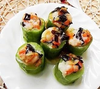8.將蝦餡塞進黃瓜盅中,入沸水蒸鍋中蒸5分鐘出鍋