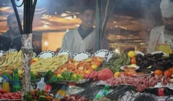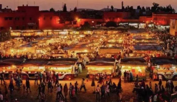 上百個大排檔在廣場上擺開架勢,人們碼放好桌子和長凳,支起帳篷,燈火通明,人頭攢動,整個廣場儼然變成了一個巨大的露天餐廳。賣茶的、果汁的、甜點的、乾果的、蝸牛的、羊雜碎的、濃湯的、燒烤的,應有盡有。