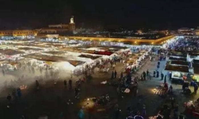在馬拉喀什,不得不去的就是Dejemma el-Fna廣場,這個廣場是馬拉喀什的核心,被評為聯合國文化遺產,被稱為open- air theatre。這裡在白天看來平平無奇,只有些賣果汁乾果的攤檔。一到黃昏,金黃色的陽光打在廣場邊的宣禮塔上,這個大廣場就像變戲法似的熱鬧起來。隨著夜幕降臨,夜市大排檔的濃煙接管了廣場上方的夜空,這才到了最精彩的時候。